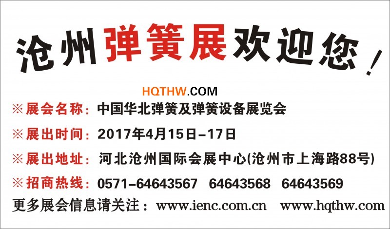 2017中国华北弹簧及弹簧设备展览会将于2017年4月15-17日在河北沧州国际会展中心(沧州市上海路88号)举行,欢迎参展、参观!