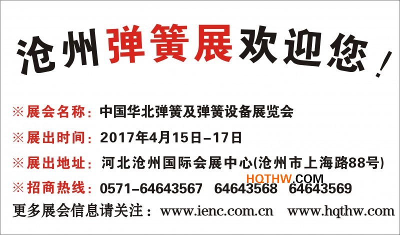 2017中国华北弹簧及弹簧设备展览会将于2017415-17日在河北沧州国际会展中心(沧州市上海路88号)举行,欢迎参展、参观!