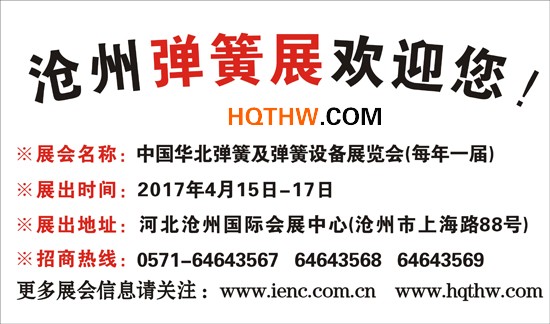 2017中国华北弹簧及弹簧设备展览会将于2017年4月15-17日在河北沧州国际会展中心(沧州市上海路88号)举行,欢迎参展、参观!