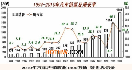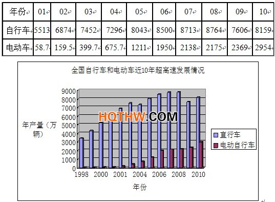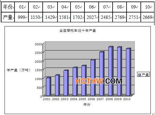 (2)从2008年以后,摩托车产量有减少的趋势,2010年比2008年减少3.6%。