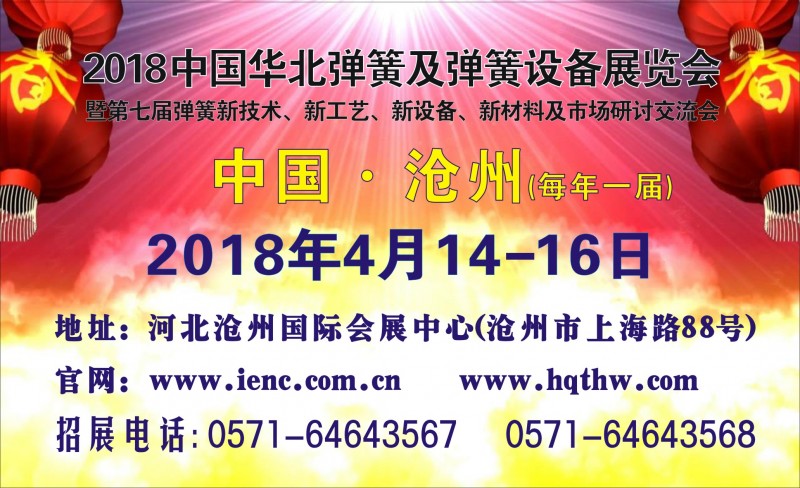 2018年4月14~16日在河北沧州国际会展中心举办中国华北弹簧及弹簧设备展览会,欢迎参展、参观!