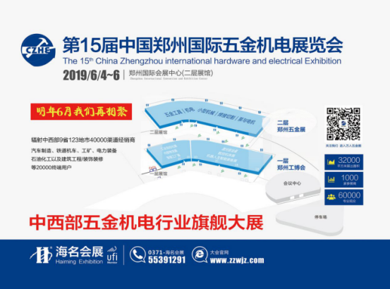 第15届中国郑州国际五金机电展览会将于2019年6月4-6日在郑州国际会展中心举办,“郑州工博会”同期举办,本届展会展出面积32000㎡,1000家展商同台竞技,40000余中西部9省123地市渠道经销商及20000余汽车制造、轨道机车、工矿、电力装备、石油化工、建筑工程/装饰装修等终端用户到会参观采购,为展商、观众提供一个最优的商贸交流机会。