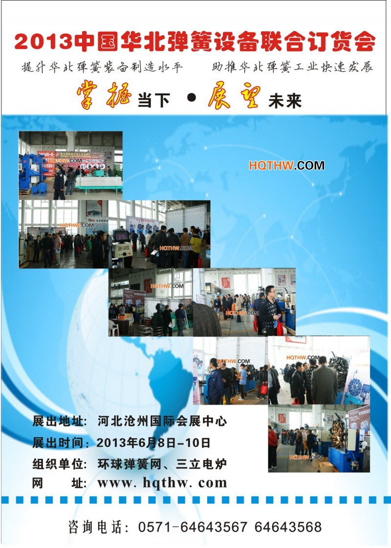 2012年《环球弹簧网》、三立电炉在河北沧州成功举办了第一届“聚能行”2012’弹簧设备联合订货会,十余家设备参展企业、数百家弹簧企业和近千名专业观众直接进行对话交流,参观人次及成交额达到了意想不到的效果。《环球弹簧网》为销售、采购双方搭建了供需桥梁,实行近距离、全天候的服务,被许多弹簧企业喻为“家门口的展会”,受到各方一致好评。在总结第一届联合订货会经验的基础上,《环球弹簧网》为了进一步推动华北及周边地区弹簧工业的发展,组织了第二届2013’中国华北弹簧设备联合订货会,为华北地区弹簧生产企业提供便捷的设备参观、技术交流、设备采购平台,介绍、展示优惠且先进的弹簧成型、热处理、试验检测等设备,同时也为广大先进设备制造企业促销和扩大知名度做好全面的服务。