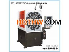 KCT-0520WZ型5轴数控万能弹簧成型机,加工线径为0.2-2.2毫米,是在开创机械现有机型20B型电脑弹簧机的基础上改进并研发的新型多功能电脑万能卷簧机。0520WZ型五轴电脑弹簧机是一款利用台湾京微620/益图电脑系统程序控制的高精度数控弹簧成型机,采用日本先进的工业伺服安川/三洋驱动系统,透过CNC程式码,分别对送线系统与凸轮传动系统做同步的控制,可达到24小时精确的运转。此机一共有5轴,凸轮一轴、送线一轴、转芯一轴、转线一轴和卷曲一轴(可订配),适合生产各种压簧、拉簧、单(双)扭簧、塔形簧、扁线簧、异形弹簧及复杂的线成型产品等。