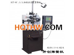 KCT-8C二/三轴数控高速卷簧机,俗称八型电脑弹簧机,也就是八型机(电八机),生产线径为0.15-0.8mm的弹簧,主要适用于电池弹簧、玩具弹簧、压簧、灯饰弹簧、压缩弹簧、文具弹簧、油封弹簧、单双锥形弹簧、弹匣弹簧、双扭簧及各式简单线材成型等弹簧产品。其中可选购配件扭簧装置、油封装置、撬角装置、检长仪等。八型机有二或三轴的,打弹簧的速度快、弹簧性能稳定,而且电脑有记忆功能,输入方便,调试简单。对于做精密弹簧或微型弹簧的朋友来说,此机是做好的选择。此外开创弹簧机的相关配件采用日本的三洋(安川)伺服马达、台湾进口京微电脑(620电脑)控制器及德国进口轴承等,质量有保证,售后有保障。