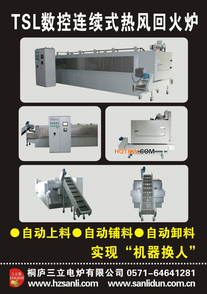 ●连续式热风回火炉(网带炉),也称输送带式电控回火炉(网带炉),采用进口PID智能化温度控制仪及完整的自动控制系统,在500℃炉温内,可按工艺要求设定任何温度,控温精度±3℃,配有热风搅拌装置,炉温精确均衡,回火工件质量稳定可靠。