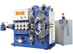 送料轮在液压力的作用下,将钢丝压紧;通过送料轮的旋转将放在料架上的钢丝拉入校直架,经校直后的钢丝,通过线板导向被推向顶簧销,在上下顶簧销和线板出口三点力的作用下,使钢丝发生弯曲变形,从而得到其所需要的各种不同直径的圆形弹簧。弹簧直径的大小可通过顶簧销上下移动来实现。弹簧节距的变化是通过节距爪的前后移动来实现的。一个弹簧卷制完成后,可通过芯刀和切刀将其切下。从而就得到了您所需要的弹簧。