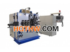 SCM5—8 0CNC卷簧机为五轴电脑控制机。一轴为送线,由功率为25KW的伺服电机拖动,可实现任意长度的高速、高精度送线。 (其精度可达到±O.l毫米、最高送线速度高达80米/分)。送线滚轮由汽缸压紧,调整气压的高低,便可调整送线力的大小。二、三轴为切断,由功率为7KW的二个伺服电机分别控制上,下切断滑块快速运动。实现切断和扭切。四轴为变距机构,由功率为3.5KW的伺服电机拖动,采用高精密滚动丝杠使螺距爪移动,从而保证螺距的高度精确。五轴为变径,由功率为4.5KW的伺服电机拖动,通过凸轮、平面杠杆带动变径滑块完成变径。芯轴的升降由电机控制,及方便又省力。在制造方面岁本机传动中的所有齿轮和滑动导轨及滑块,均经淬硬磨削精制而成。确保整个系统传动精确、运行平稳、耐磨和长寿命。本机采用电脑数值控制尹五轴中的任意一轴可以独立运动,也可使其中任意几轴协调联动,使其操作极为方便,使复杂的调试过程变的极为简单。