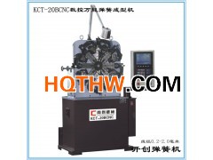 KCT-20B三/四轴数控万能弹簧成形机,简称20型弹簧机/20电脑机,是电脑八爪机的一种(即电脑万能卷簧机),其生产线径为0.2-2.0mm,主要生产各种压簧、单双扭簧、拉簧、塔形簧扁线弹簧及复杂的线材成型产品等,诸如涡卷弹簧、电池弹簧、异形弹簧、卡簧及蛇形簧等。20B型3/4轴数控万能弹簧成型机,是一款由台湾电脑程序控制的高精度弹簧成型机,引用日本先进的工业伺服电机,透过CNC程式码,分别对送线系统与凸轮传动系统做同步控制,可达到24小时精确运转。20电脑机一共有四轴,分别为凸轮一轴、送线一轴、轴芯一轴和卷曲一轴(可订配)。由于本机采有高精度的伺服马达及电脑驱动控制,因此配合伺服卷曲一轴,即可轻松地生产出尺寸精密且角度复杂的弹簧。