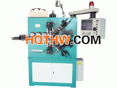 本机床采用五轴电脑控制,各轴可单独运动,任意两轴也可以同步联动。第一轴为送线轴,由功率为15Kw的伺服电机拖动,实现任意长度的高速送线,送线速度最高可达120m/Min,送线精度±0.1mm。送线滚轮由汽缸压紧,可方便调整送线力的大小。二、三、四轴为变径和上、下切断轴,分别由功率2.9Kw的伺服电机通过进口精密减速机控制。五轴为变距机构,由功率为1.8KW的伺服电机拖动,通过进口高精密滚珠丝杠使螺距爪精确移动。 芯轴升降由电机控制,方便省力。 大线径钢丝绕制小旋绕比的弹簧可采用扭切生产。 所有传动齿轮均按照6级精度经过淬火磨削精加工而成,可保证机床精密传动、低噪音平稳运行。
